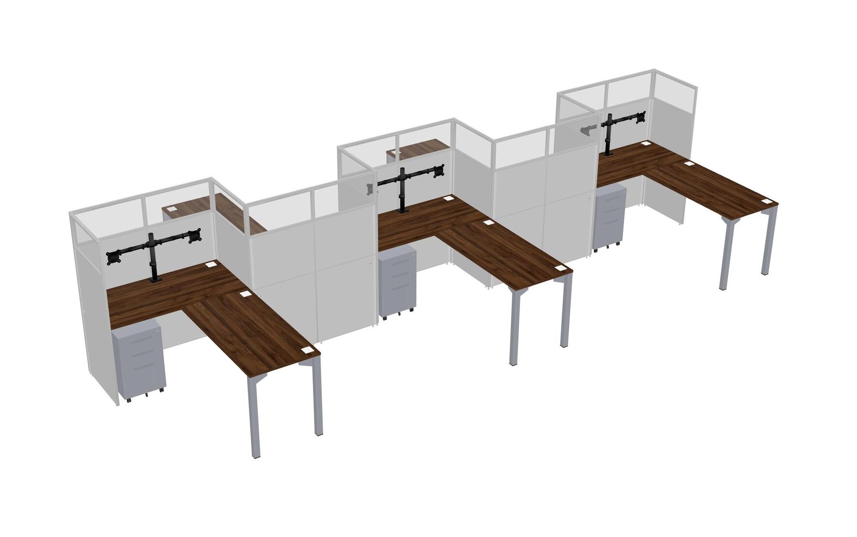 Postes De Travail En L En Noyer Columbia Pour 5 Personnes - Formation En Zigzag + Tiroirs Mobiles En Métal Gris + Retour De Panneau