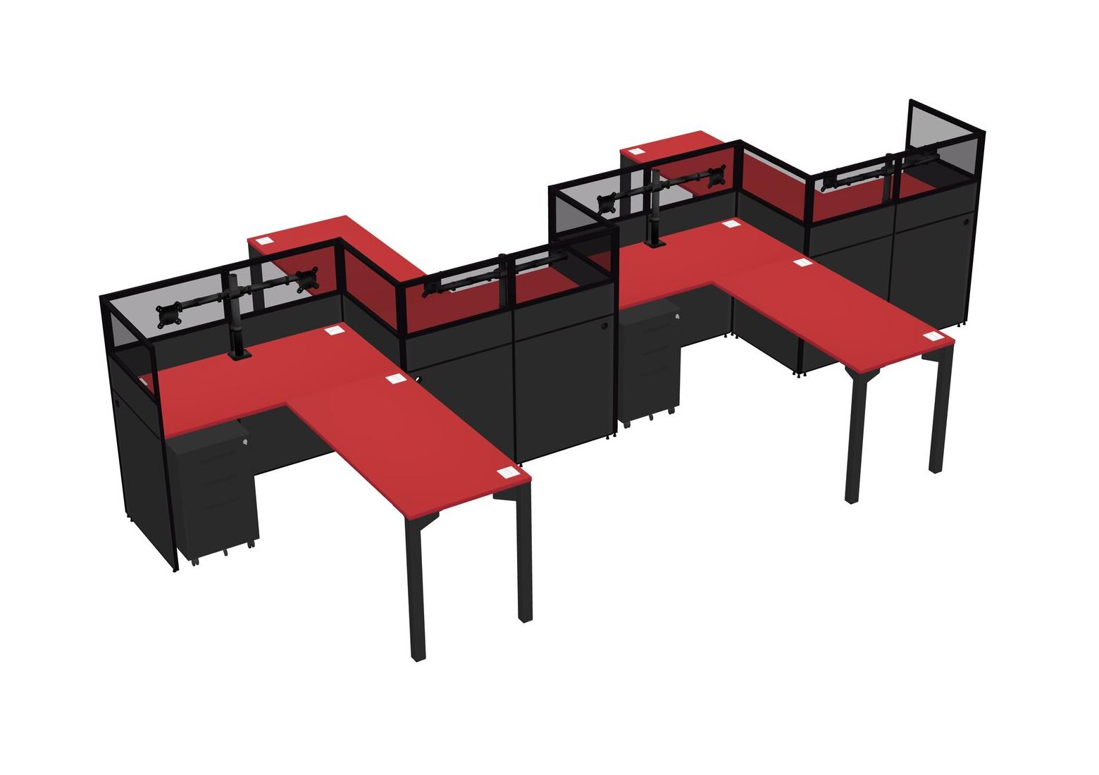 Postes De Travail En L Prism Red Pour 4 Personnes - Formation En Zigzag + Tiroirs Mobiles En Métal Noir + Retour De Panneau