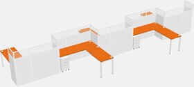 Postes De Travail En L Orange Pour 5 Personnes - Formation En Zigzag + Tiroirs Mobiles En Métal Blanc + Retour De Panneau