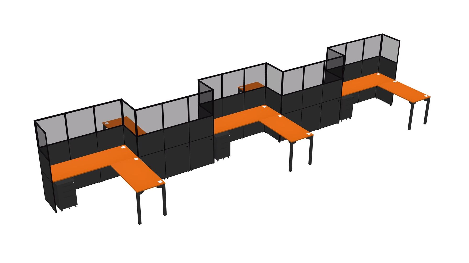 Postes De Travail En L Orange Pour 5 Personnes - Formation En Zigzag + Tiroirs Mobiles En Métal Noir + Retour De Panneau