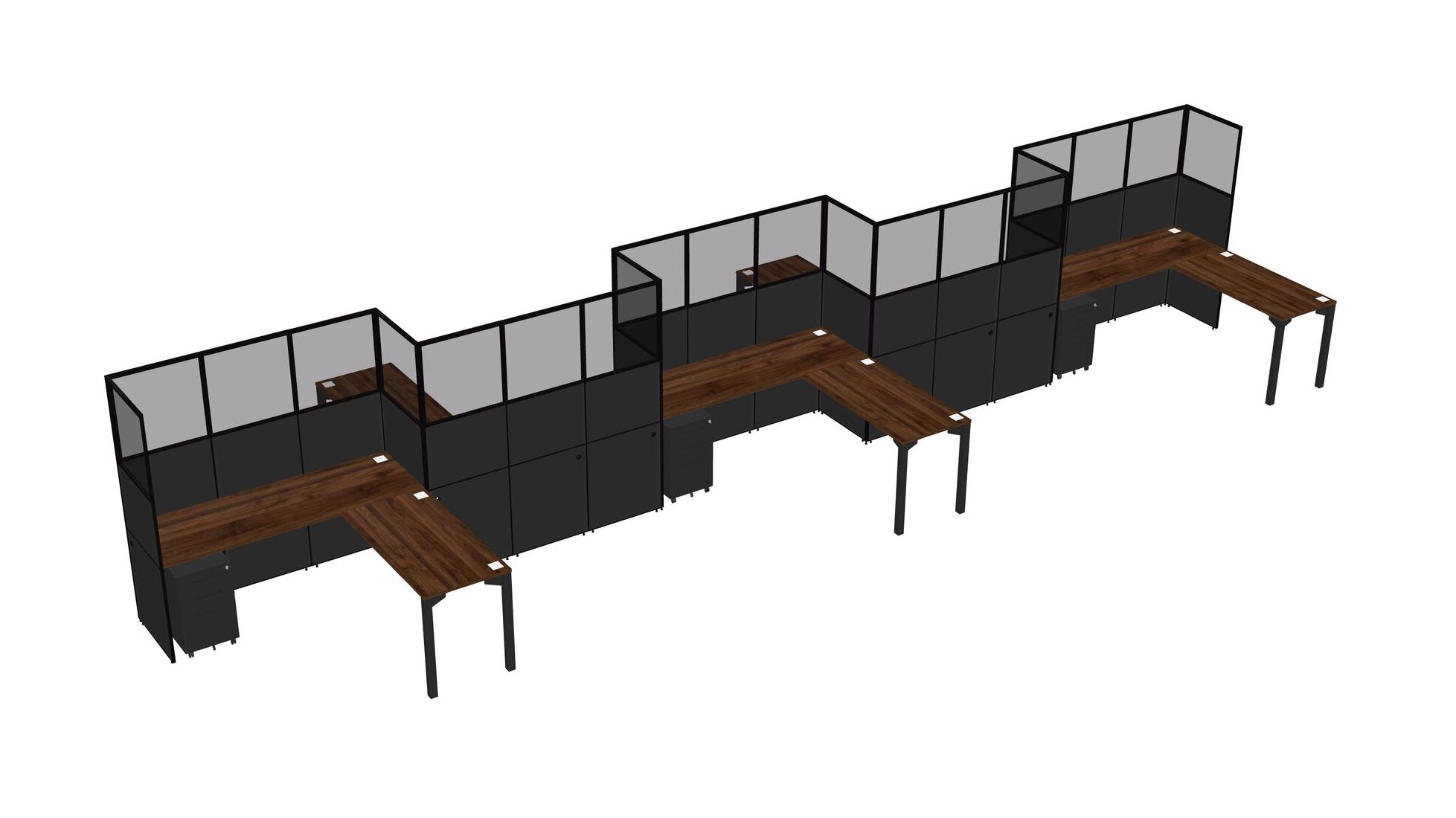 Postes De Travail En L En Noyer Columbia Pour 5 Personnes - Formation En Zigzag + Tiroirs Mobiles En Métal Noir + Retour De Panneau