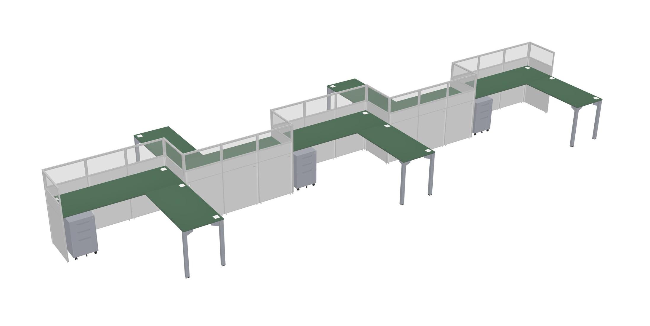 Postes De Travail En L Verts Pour 5 Personnes - Formation En Zigzag + Tiroirs Mobiles En Métal Gris + Retour De Panneau