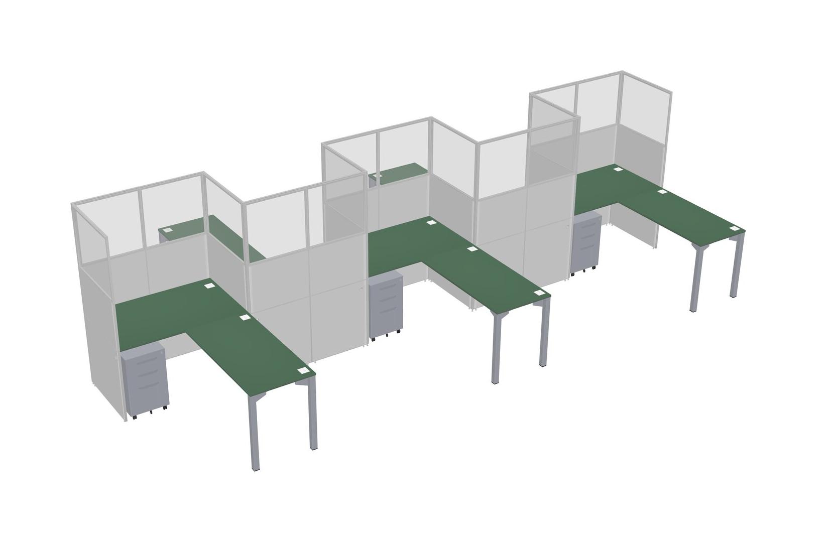 Postes De Travail En L Verts Pour 5 Personnes - Formation En Zigzag + Tiroirs Mobiles En Métal Gris + Retour De Panneau