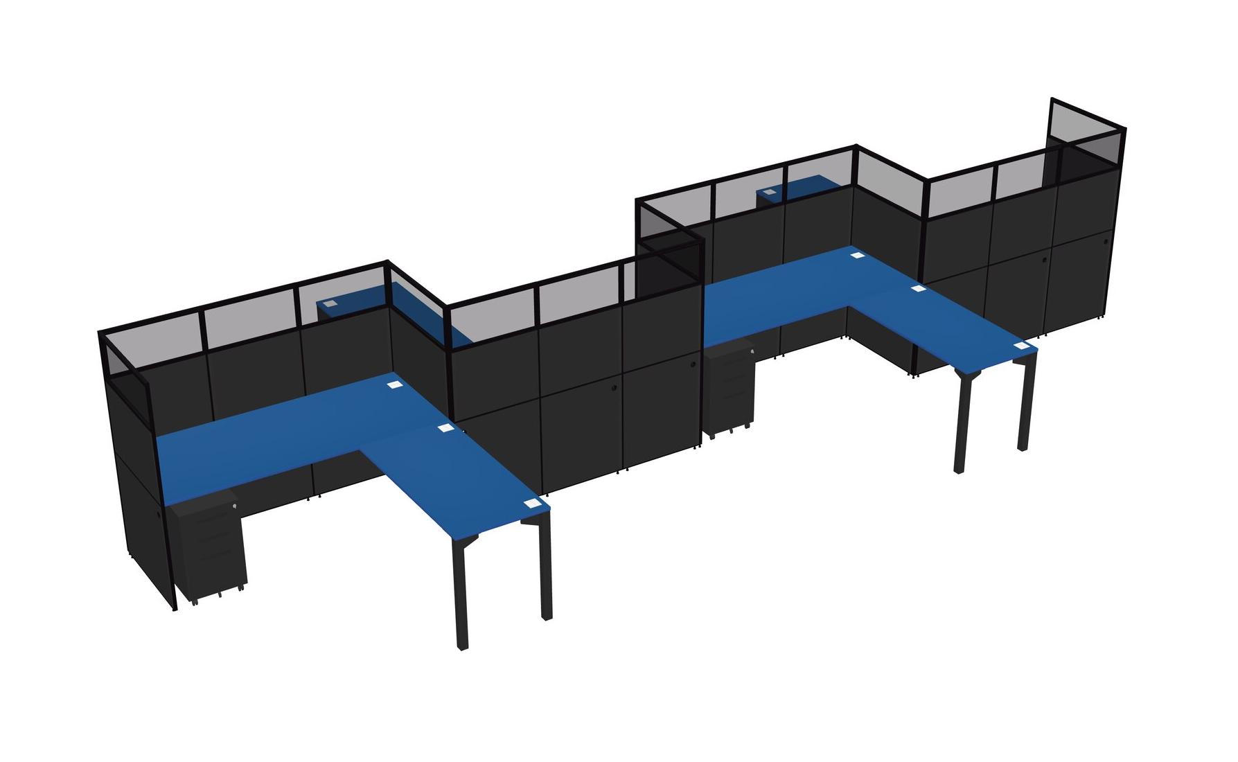 Postes De Travail En L Prism Blue Pour 4 Personnes - Formation En Zigzag + Tiroirs Mobiles En Métal Noir + Retour De Panneau