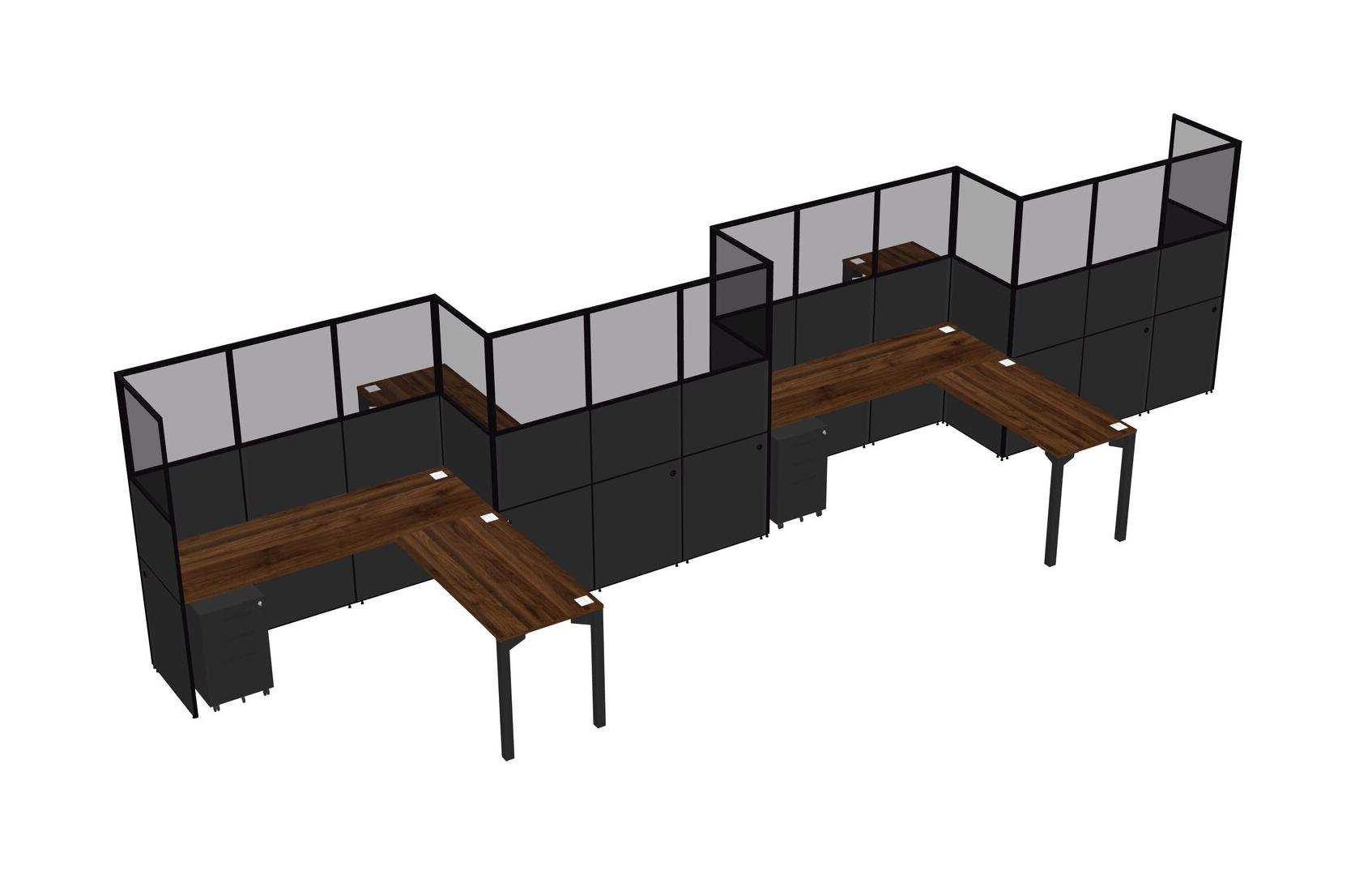 Postes De Travail En L En Noyer Columbia Pour 4 Personnes - Formation En Zigzag + Tiroirs Mobiles En Métal Noir + Retour De Panneau