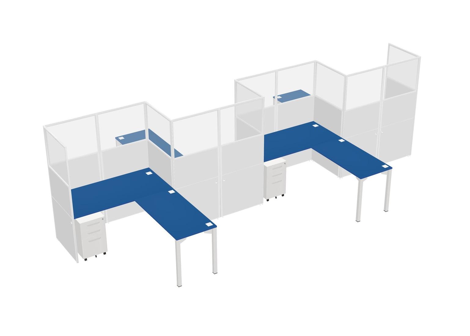 Postes De Travail En L Prism Blue Pour 4 Personnes - Formation En Zigzag + Tiroirs Mobiles En Métal Blanc + Retour De Panneau