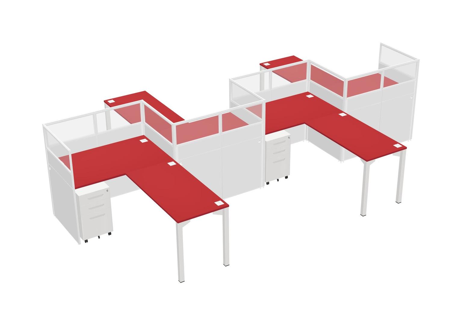Postes De Travail En L Prism Red Pour 4 Personnes - Formation En Zigzag + Tiroirs Mobiles En Métal Blanc + Retour De Panneau