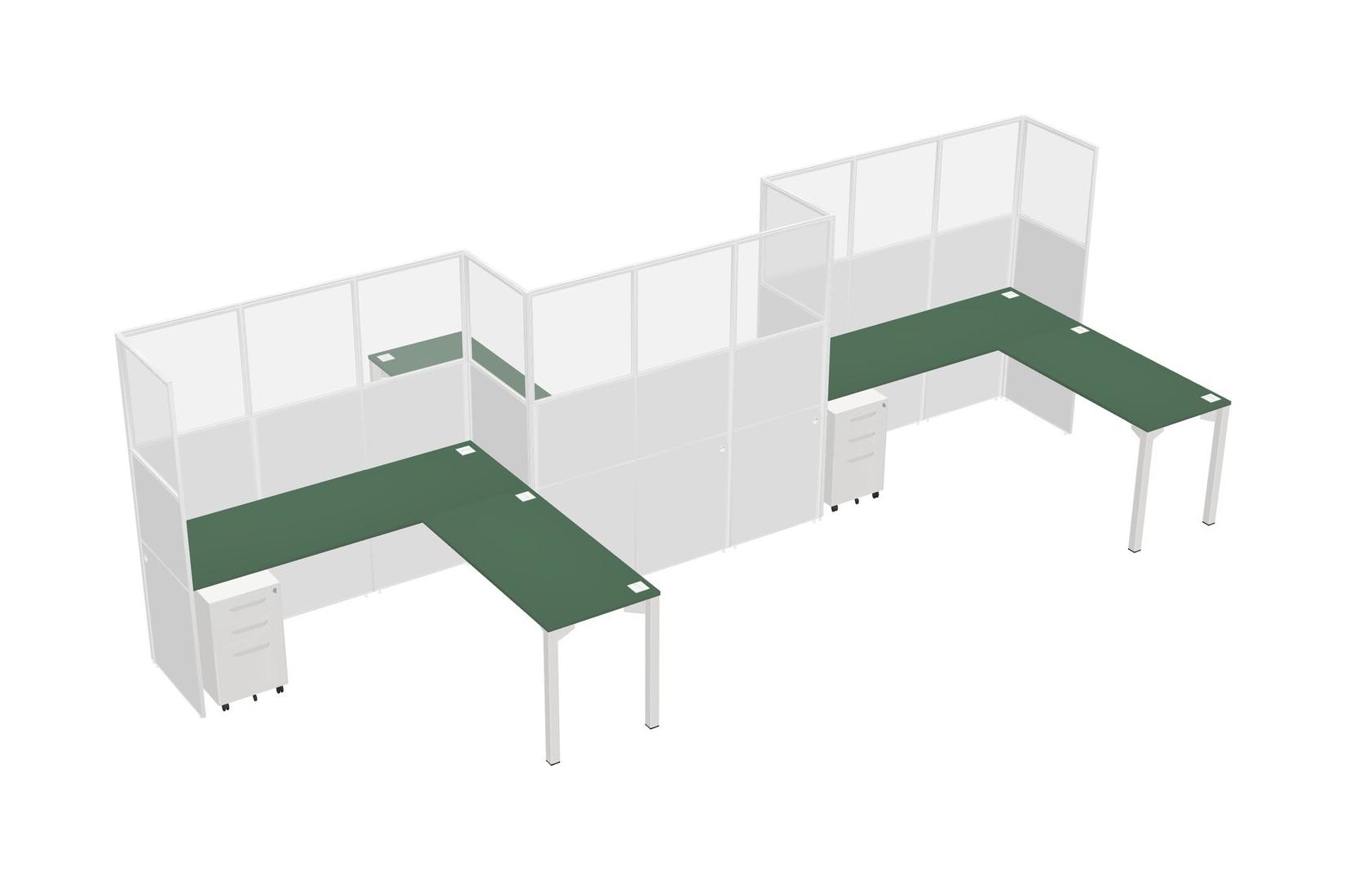 Postes De Travail En L Verts Pour 3 Personnes - Formation En Zigzag + Tiroirs Mobiles En Métal Blanc + Retour De Panneau
