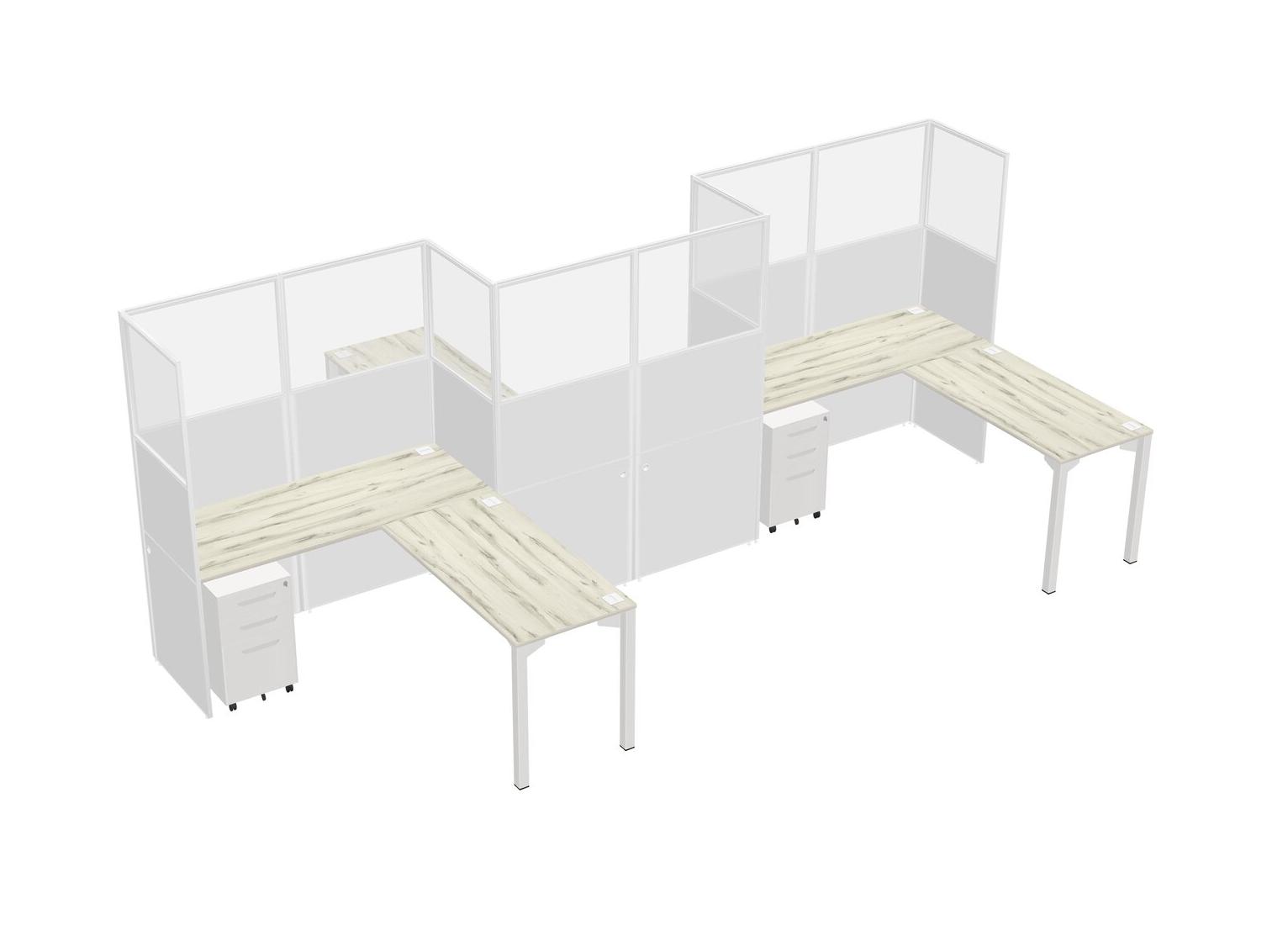 Postes De Travail En L Heinne Holz Pour 3 Personnes - Disposition En Zigzag + Tiroirs Mobiles En Métal Blanc + Retour De Panneau