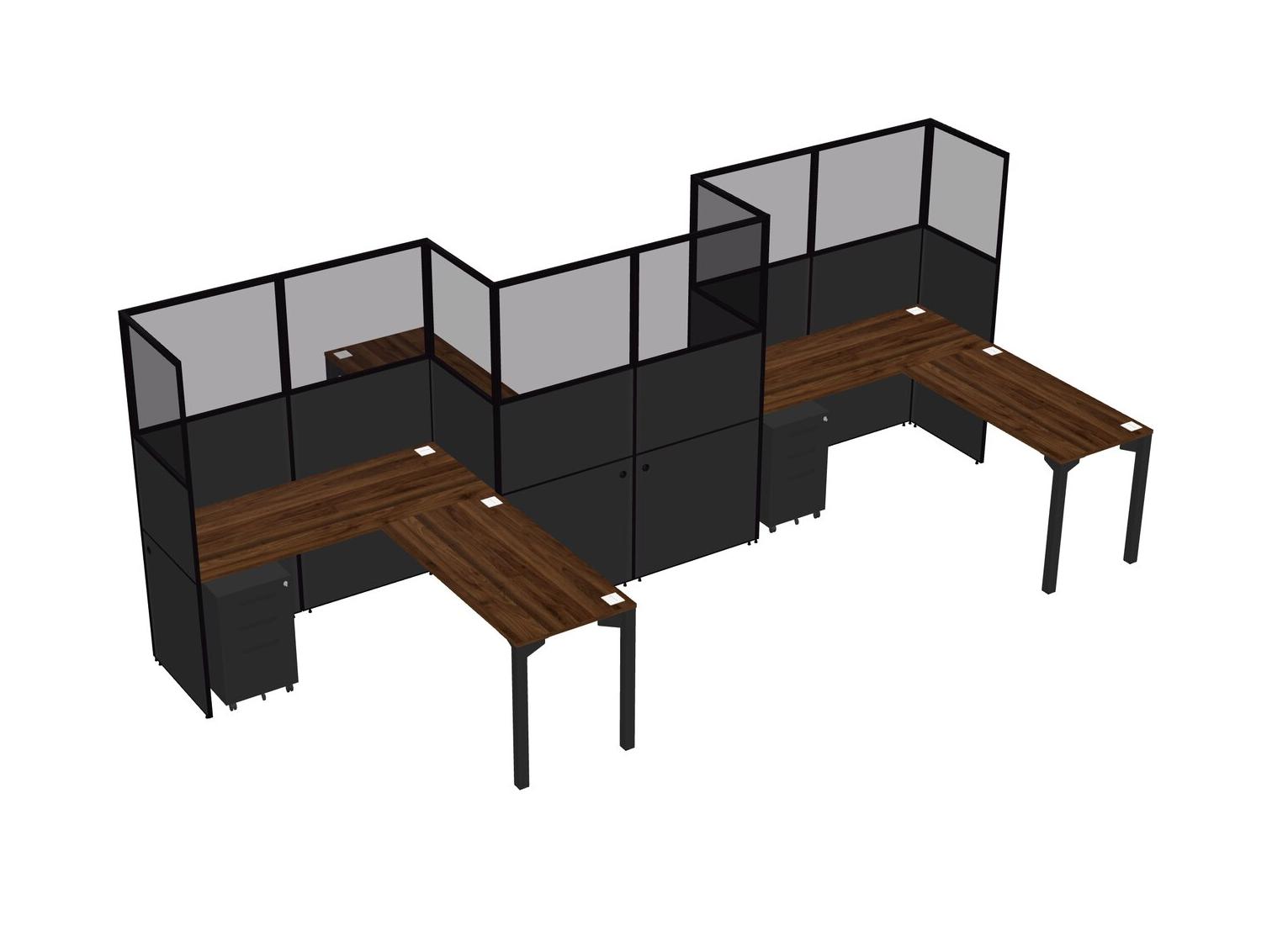 Postes De Travail En L En Noyer Columbia Pour 3 Personnes - Formation En Zigzag + Tiroirs Mobiles En Métal Noir + Retour De Panneau