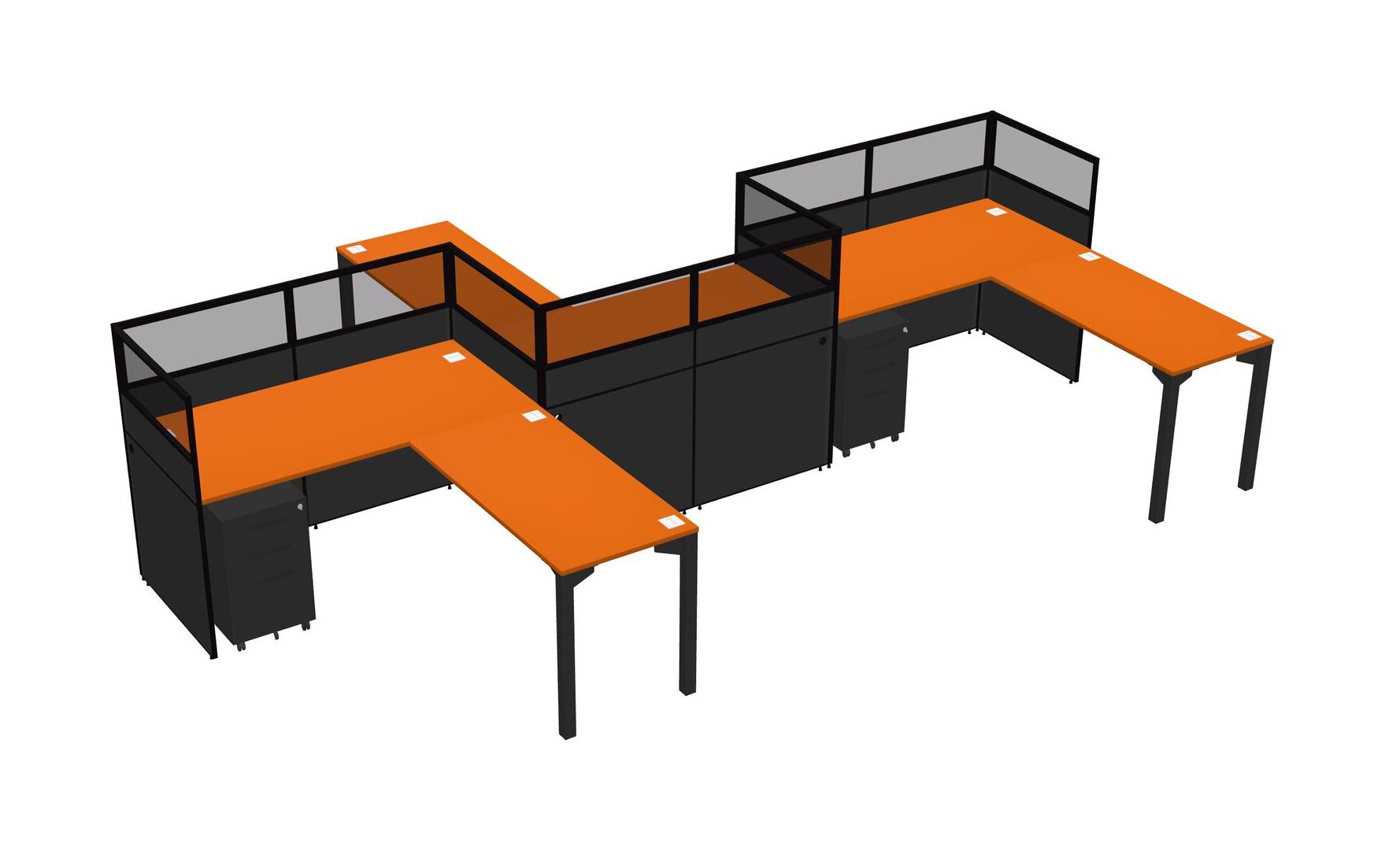 Postes De Travail En L Orange Pour 3 Personnes - Formation En Zigzag + Tiroirs Mobiles En Métal Noir + Retour De Panneau