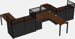 Postes De Travail En L En Noyer Columbia Pour 3 Personnes - Formation En Zigzag + Tiroirs Mobiles En Métal Noir + Retour De Panneau