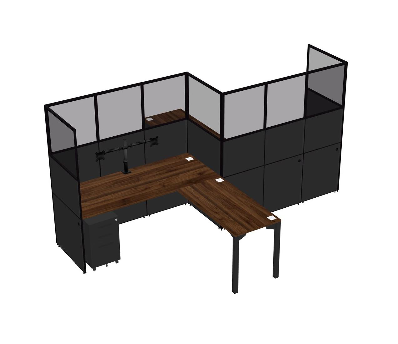 Postes De Travail En L En Noyer Columbia Pour 2 Personnes - Formation En Zigzag + Tiroirs Mobiles En Métal Noir + Retour De Panneau
