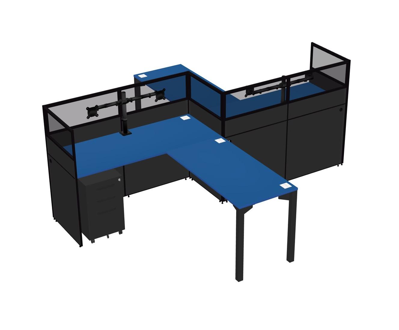Postes De Travail En L Prism Blue Pour 2 Personnes - Formation En Zigzag + Tiroirs Mobiles En Métal Noir + Retour De Panneau