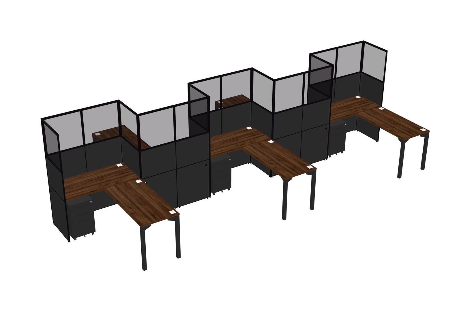 Postes De Travail En L En Noyer Columbia Pour 5 Personnes - Formation En Zigzag + Tiroirs Mobiles En Métal Noir + Retour De Panneau