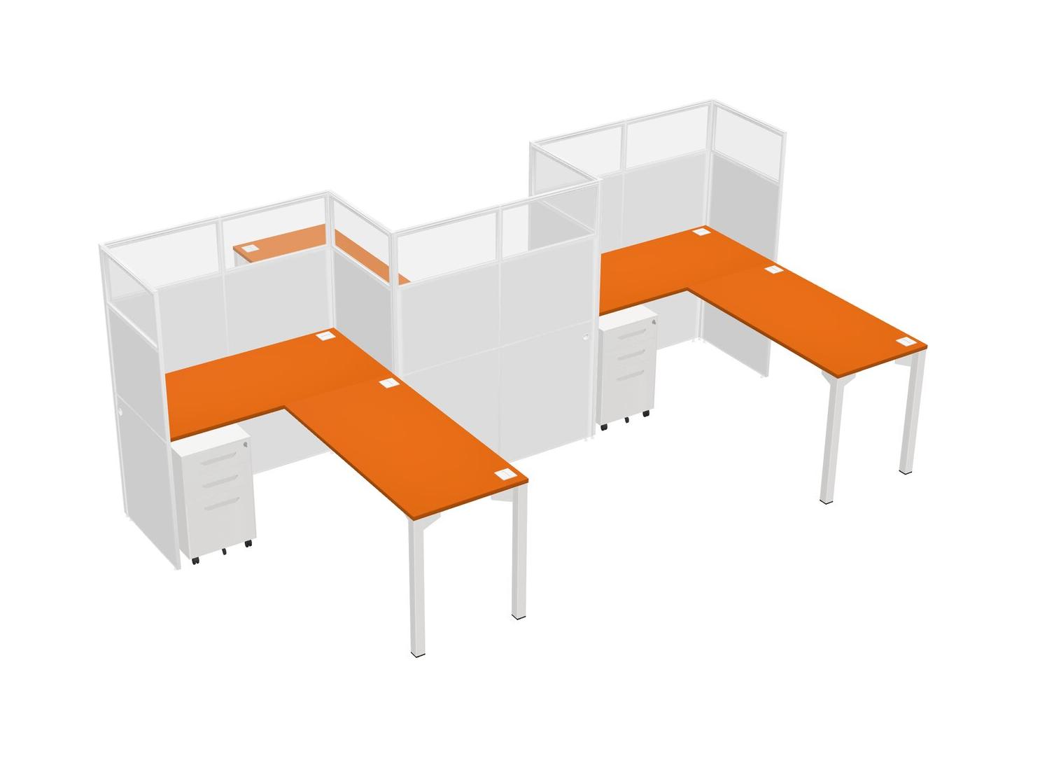 Postes De Travail En L Orange Pour 3 Personnes - Formation En Zigzag + Tiroirs Mobiles En Métal Blanc + Retour De Panneau