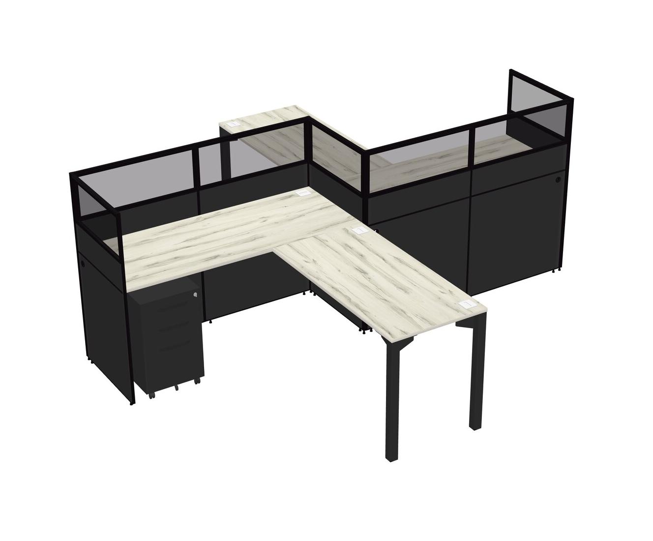 Postes De Travail En L Heinne Holz Pour 2 Personnes - Formation En Zigzag + Tiroirs Mobiles En Métal Noir + Retour De Panneau