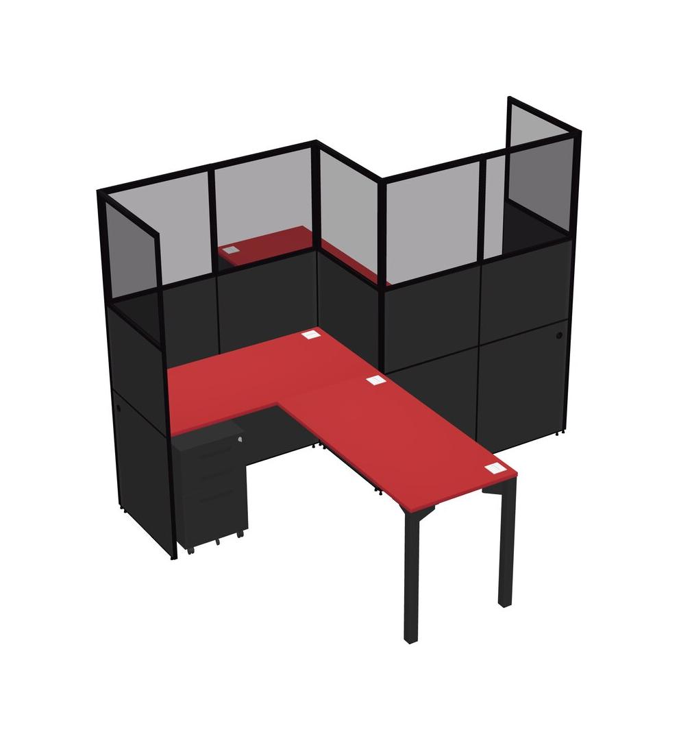 Postes De Travail En L Prism Red Pour 2 Personnes - Formation En Zigzag + Tiroirs Mobiles En Métal Noir + Retour De Panneau