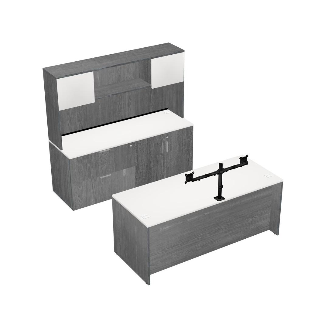Bureau Parallèle Blanc Avec Rangement Latéral Combiné + Tiroirs Mobiles En Bois + Clapier + Bras D'écran (bras Doubles)