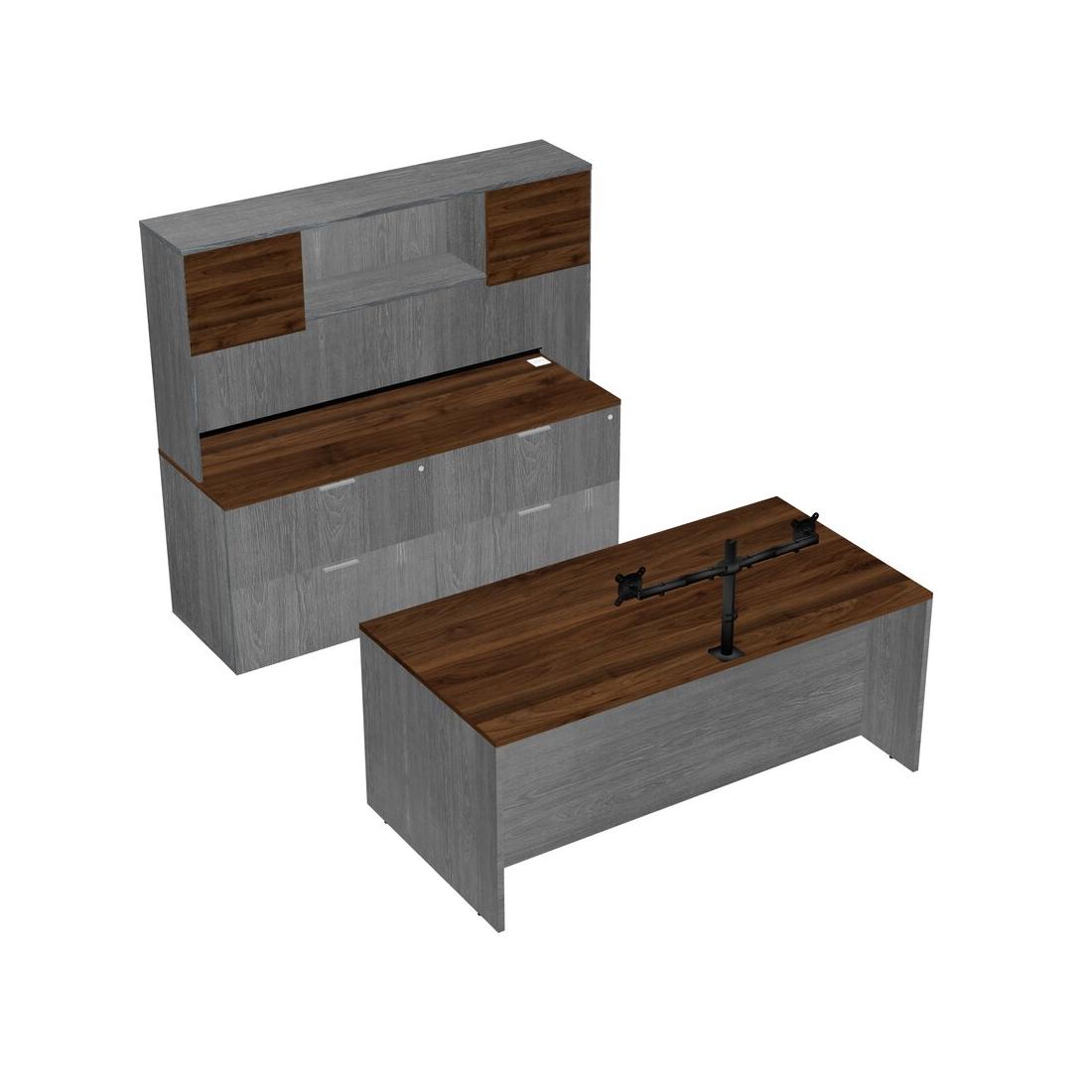 Bureau Parallèle En Noyer Columbia Avec Classeur Latéral, Clapier Et Bras Pour écran (bras Doubles)
