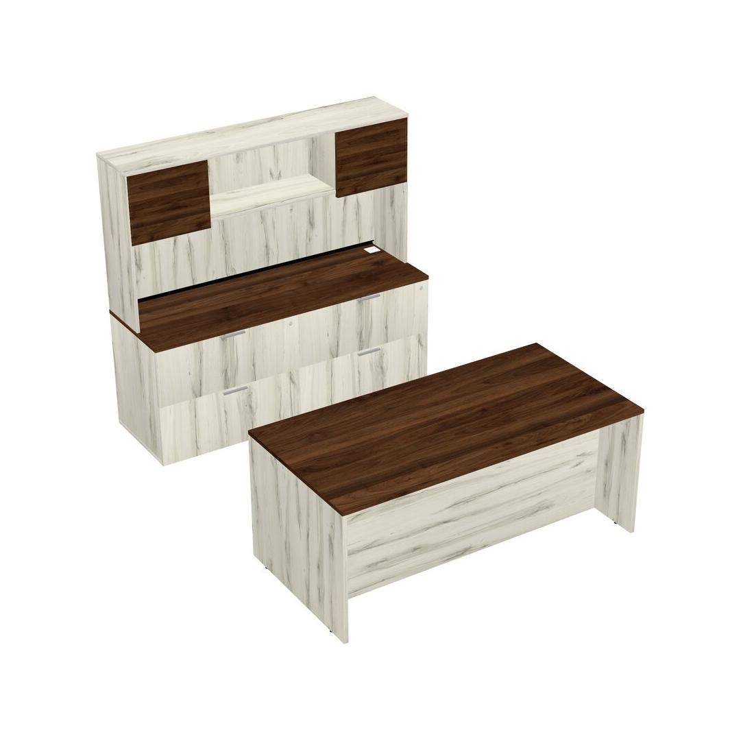 Bureau Parallèle En Noyer Columbia Avec Classeur Latéral, Tiroirs Mobiles En Bois Et Clapier