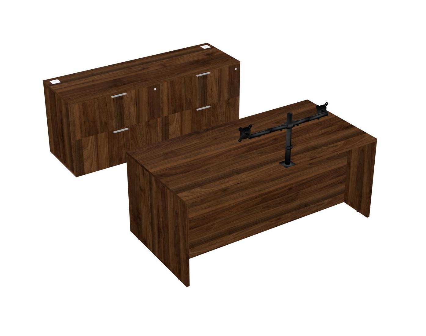 Bureau Parallèle En Noyer Columbia Avec Classeur Latéral, Tiroirs Mobiles En Bois Et Bras D'écran (bras Doubles)