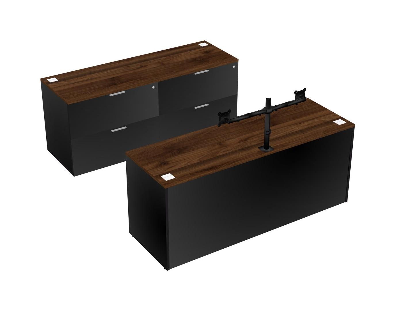 Bureau Parallèle En Noyer Columbia Avec Classeur Latéral, Tiroirs Mobiles En Bois Et Bras D'écran (bras Doubles)