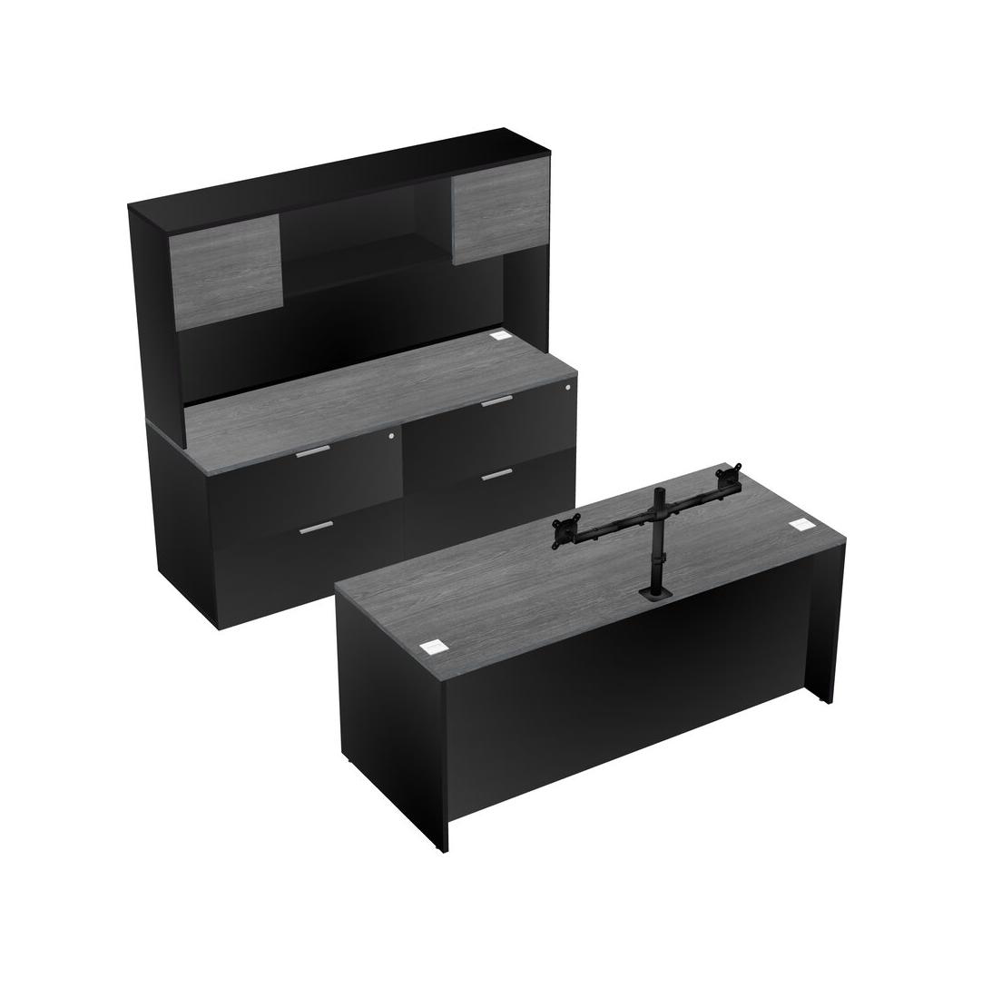 Bureau Parallèle Gris Avec Classeur Latéral, Clapier Et Bras D'écran (bras Doubles)