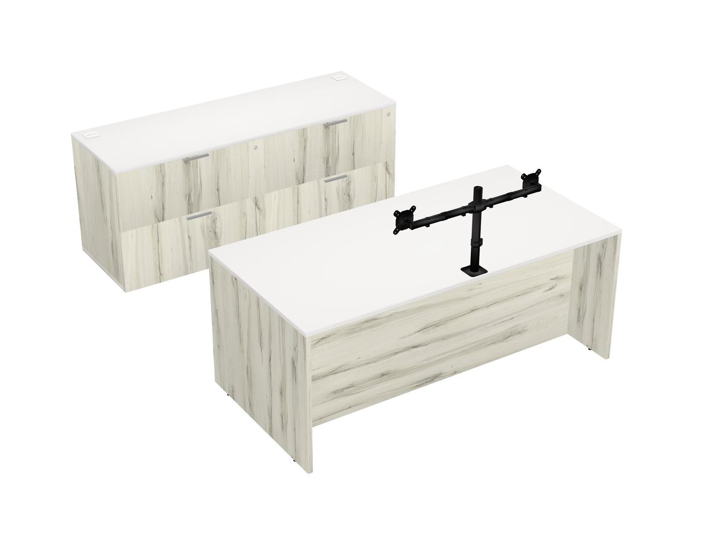 Bureau Parallèle Blanc Avec Classeur Latéral Et Bras Pour écran (bras Doubles)