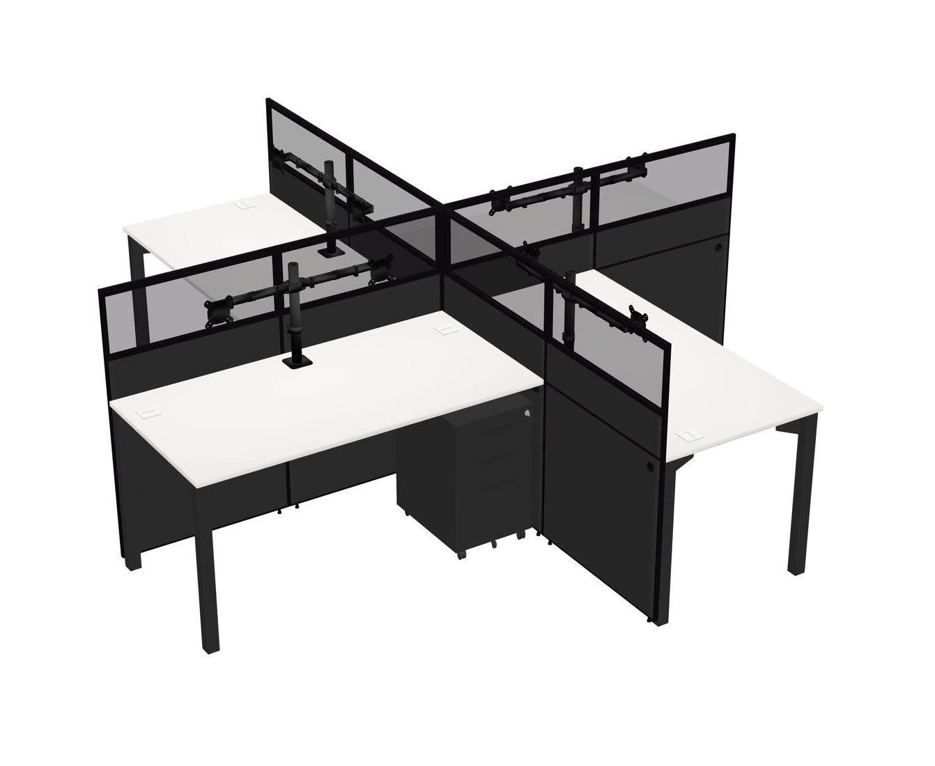 Postes De Travail Quadruples Blancs Pour 4 Personnes + Tiroirs Mobiles En Métal Noir + Bras Pour écran (bras Doubles)