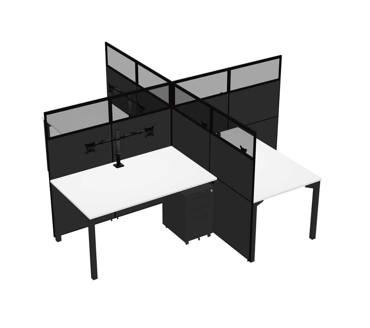 Postes De Travail Quadruples Blancs Pour 4 Personnes + Tiroirs Mobiles En Métal Noir + Bras Pour écran (bras Doubles)