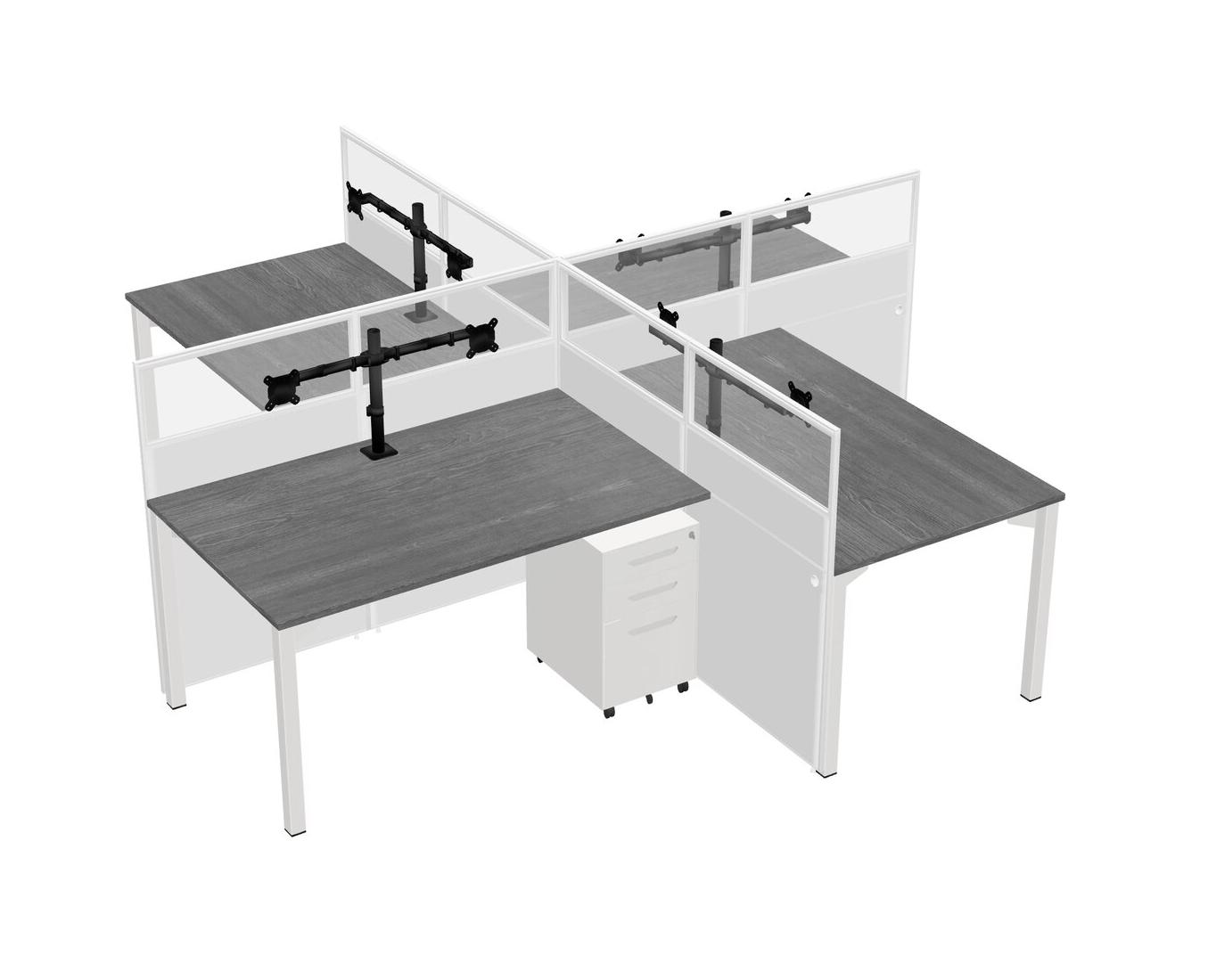 Postes De Travail Quadruples Gris Pour 4 Personnes + Tiroirs Mobiles En Métal Blanc + Bras Pour écran (bras Doubles)