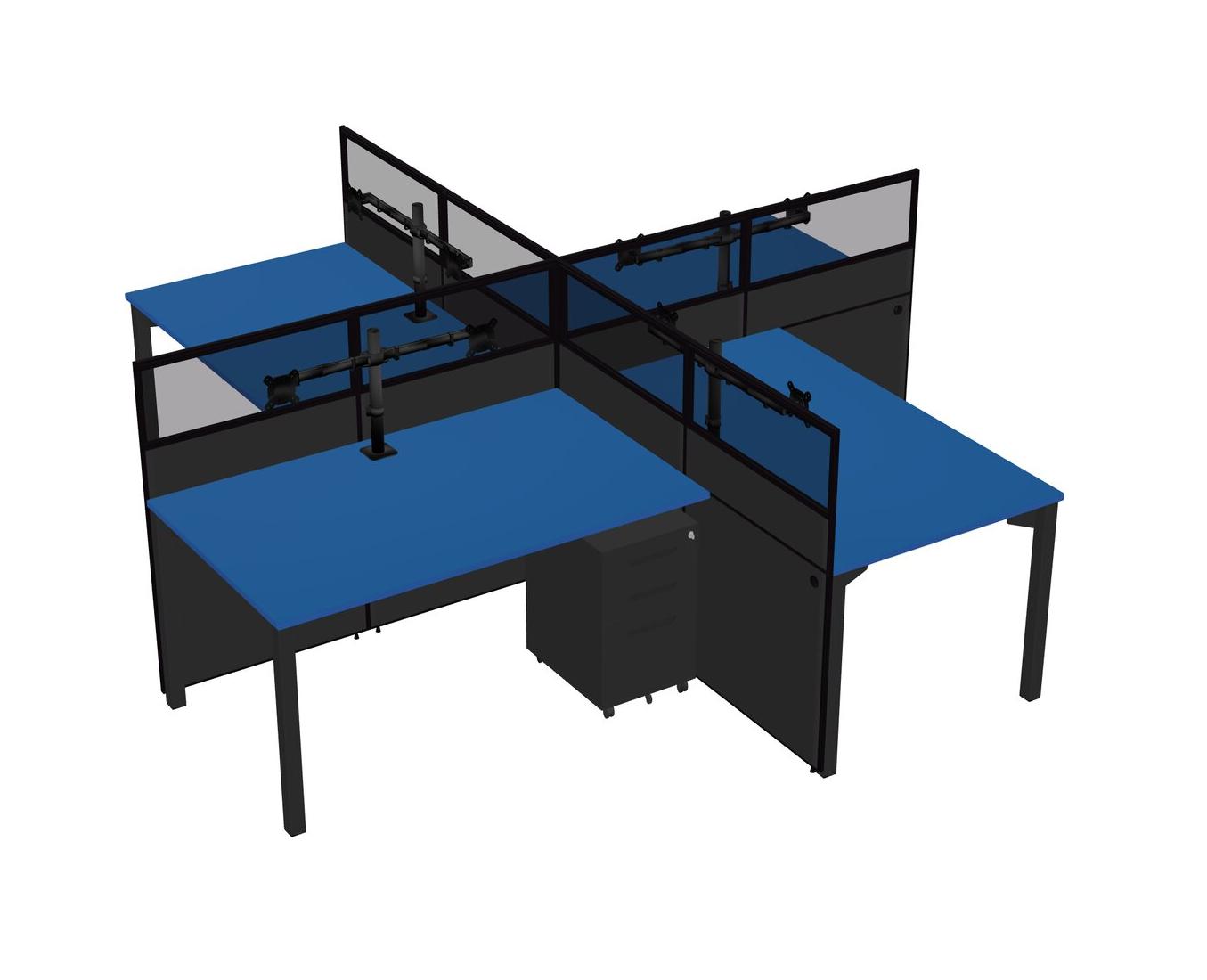 Postes De Travail Quadruples Prism Blue Pour 4 Personnes + Tiroirs Mobiles En Métal Noir + Bras Pour écran (bras Doubles)