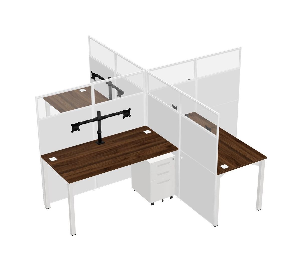 Postes De Travail à Quatre Compartiments En Noyer Columbia Pour 4 Personnes + Tiroirs Mobiles En Métal Blanc + Bras Pour écran (bras Doubles)