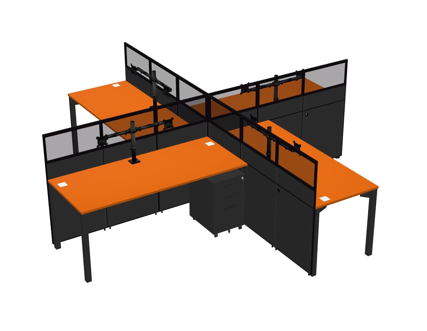 Postes De Travail Quadruples Orange Pour 4 Personnes + Tiroirs Mobiles En Métal Noir + Bras Pour écran (bras Doubles)