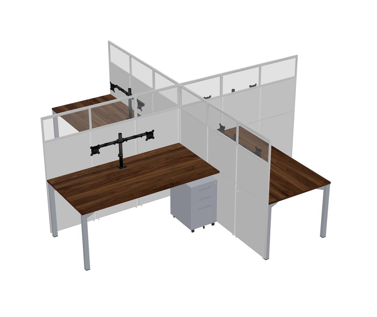 Postes De Travail à Quatre Compartiments En Noyer Columbia Pour 4 Personnes + Tiroirs Mobiles En Métal Gris + Bras Pour écran (bras Doubles)