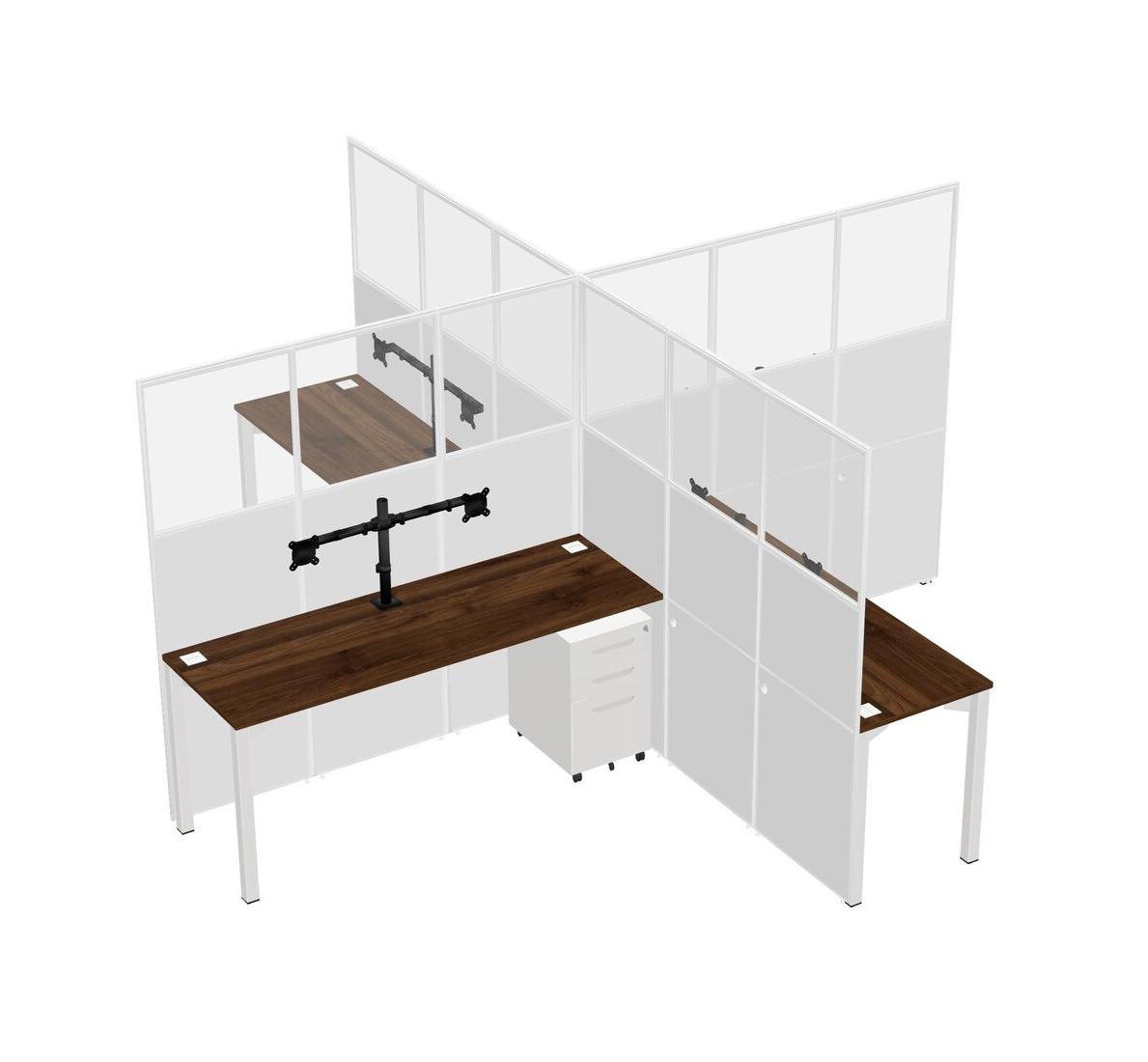 Postes De Travail à Quatre Compartiments En Noyer Columbia Pour 4 Personnes + Tiroirs Mobiles En Métal Blanc + Bras Pour écran (bras Doubles)