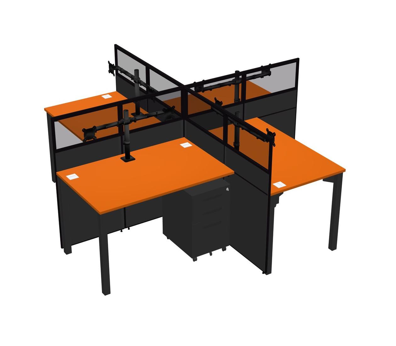 Postes De Travail Quadruples Orange Pour 4 Personnes + Tiroirs Mobiles En Métal Noir + Bras Pour écran (bras Doubles)