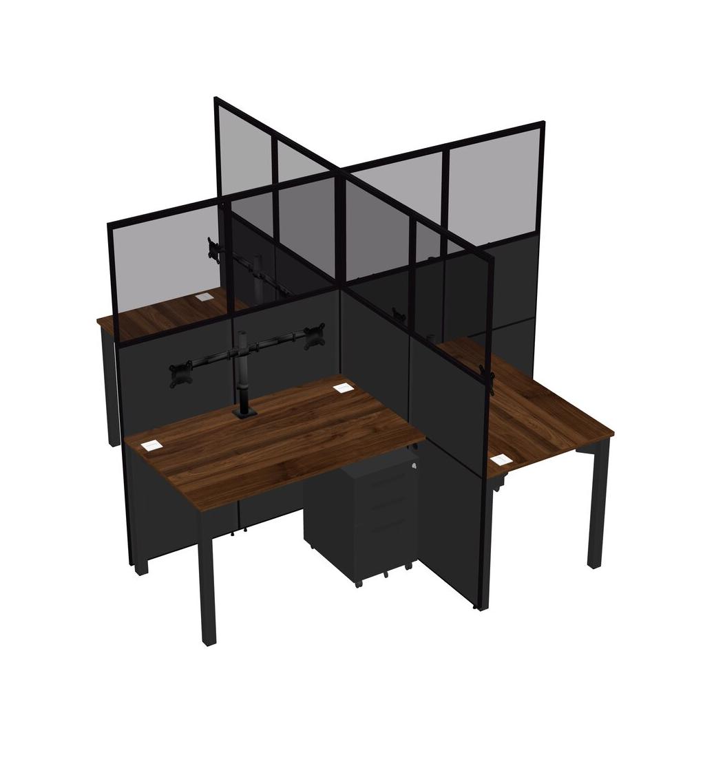 Postes De Travail à Quatre Compartiments En Noyer Columbia Pour 4 Personnes + Tiroirs Mobiles En Métal Noir + Bras Pour écran (bras Doubles)
