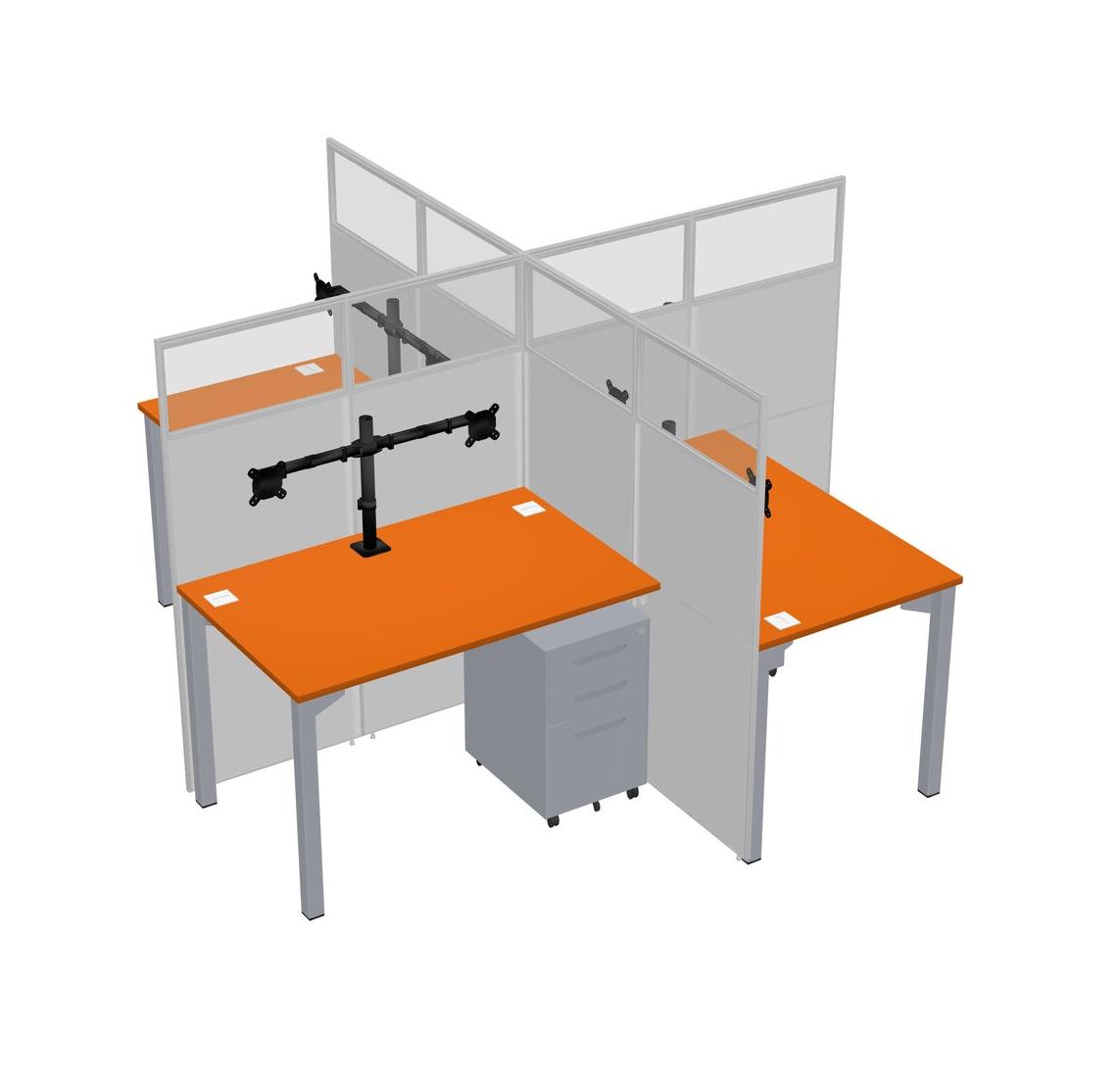 Postes De Travail Quadruples Orange Pour 4 Personnes + Tiroirs Mobiles En Métal Gris + Bras Pour écran (bras Doubles)