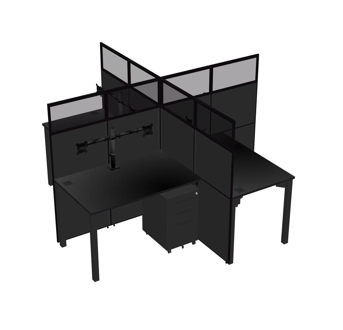 Postes De Travail Quadruples Noirs Pour 4 Personnes + Tiroirs Mobiles En Métal Noir + Bras Pour écran (bras Doubles)