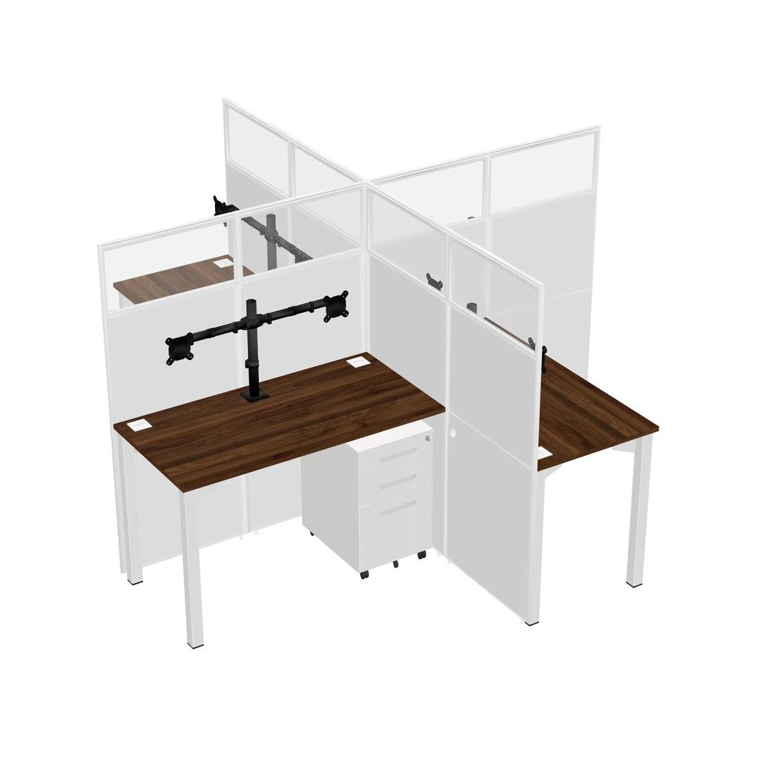 Postes De Travail à Quatre Compartiments En Noyer Columbia Pour 4 Personnes + Tiroirs Mobiles En Métal Blanc + Bras Pour écran (bras Doubles)