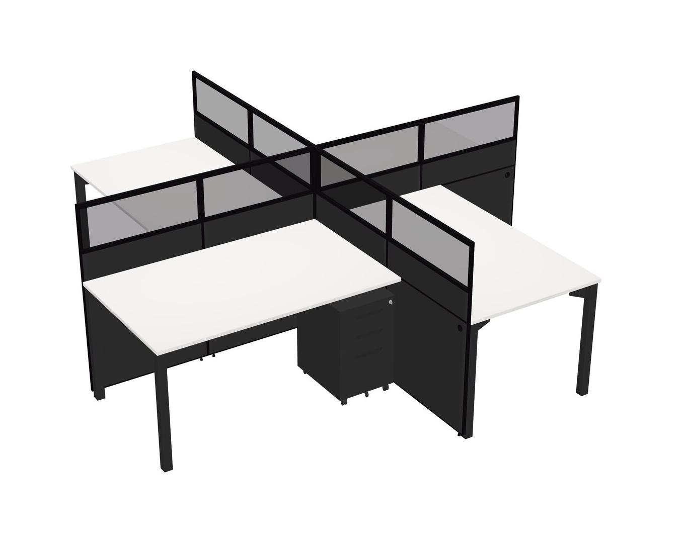 Postes De Travail Quadruples Blancs Pour 4 Personnes + Tiroirs Mobiles En Métal Noir
