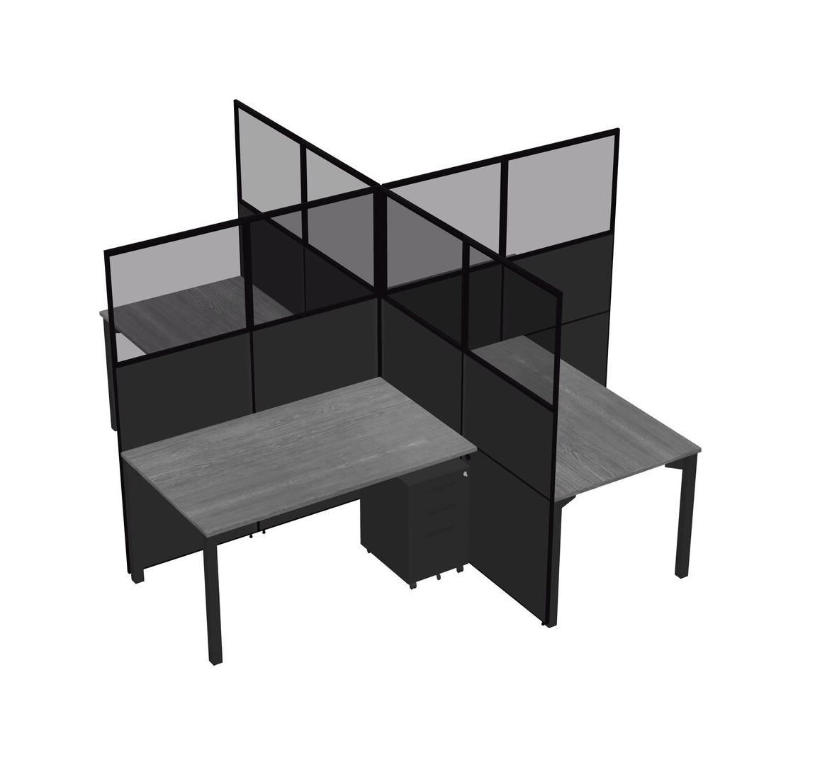 Postes De Travail Quadruples Gris Pour 4 Personnes + Tiroirs Mobiles En Métal Noir