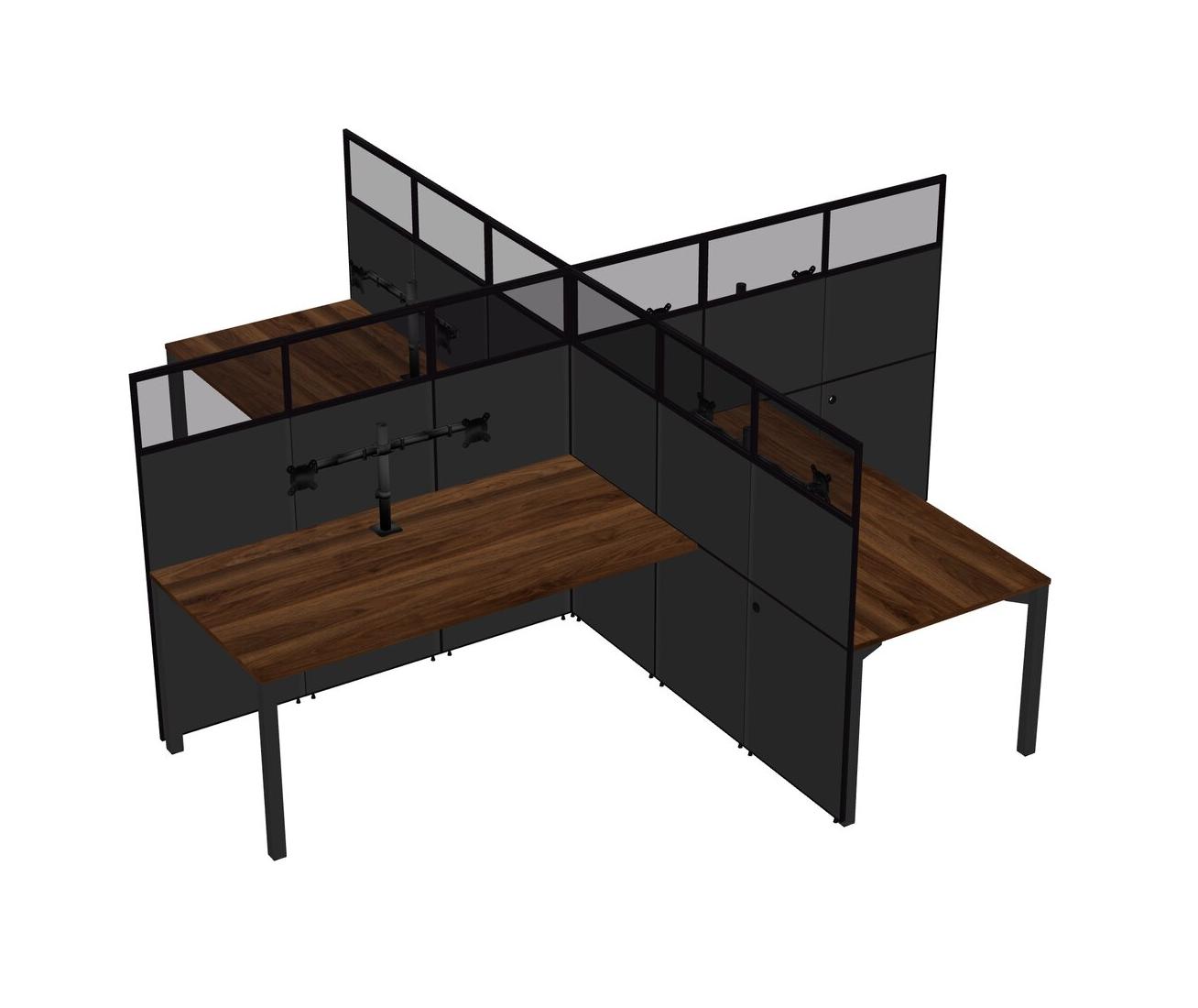 Postes De Travail à Quatre Cabines En Noyer Columbia Pour 4 Personnes + Bras Pour écran (bras Doubles)