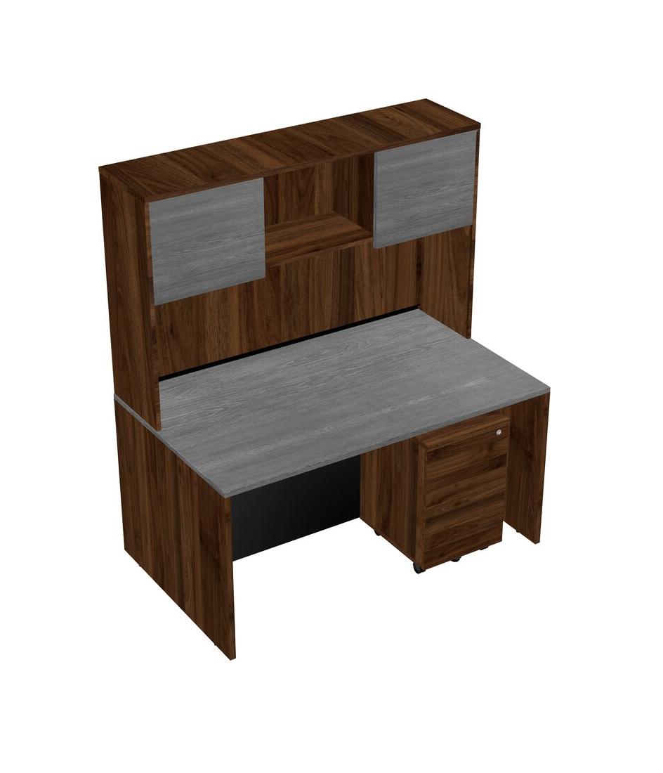Grey Rectangular Office Desk Plus Columbia Walnut Wooden Mobile Drawers And Columbia Walnut Hutch