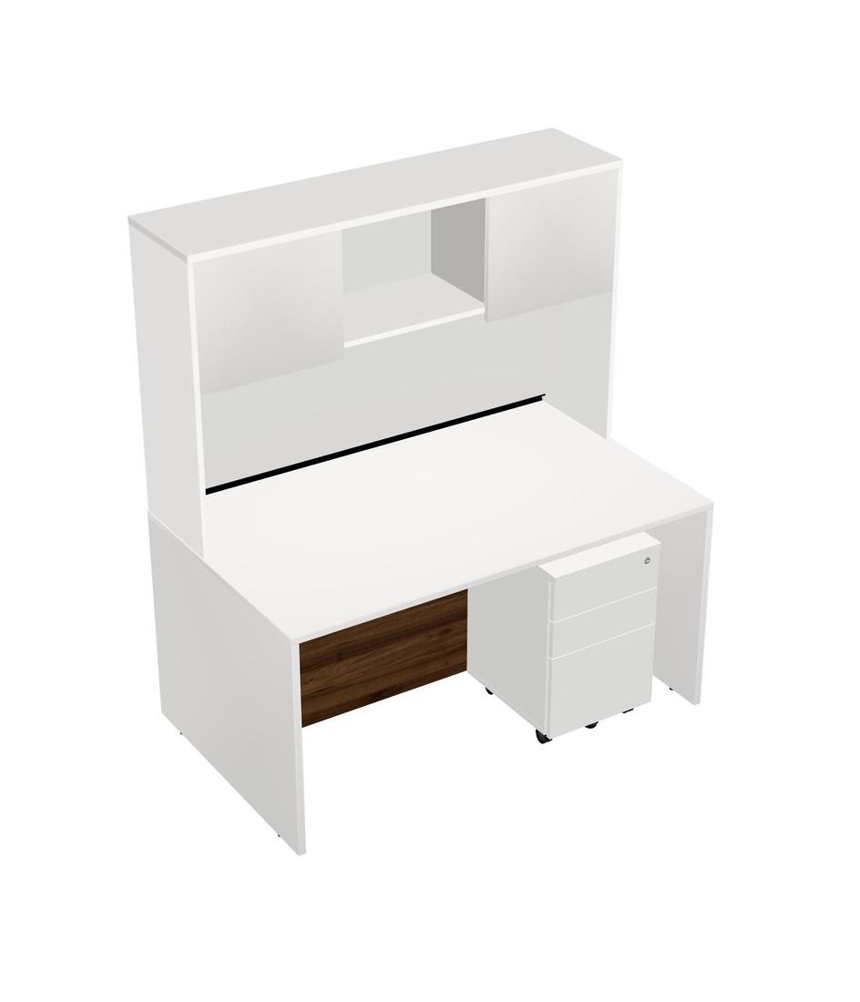 White Rectangular Office Desk Plus White Wooden Mobile Drawers And White Hutch