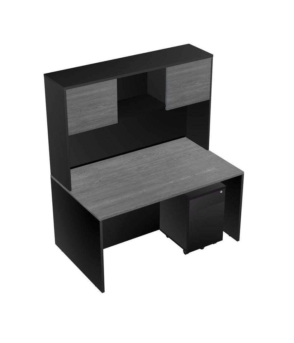 Grey Rectangular Office Desk Plus Black Wooden Mobile Drawers And Black Hutch