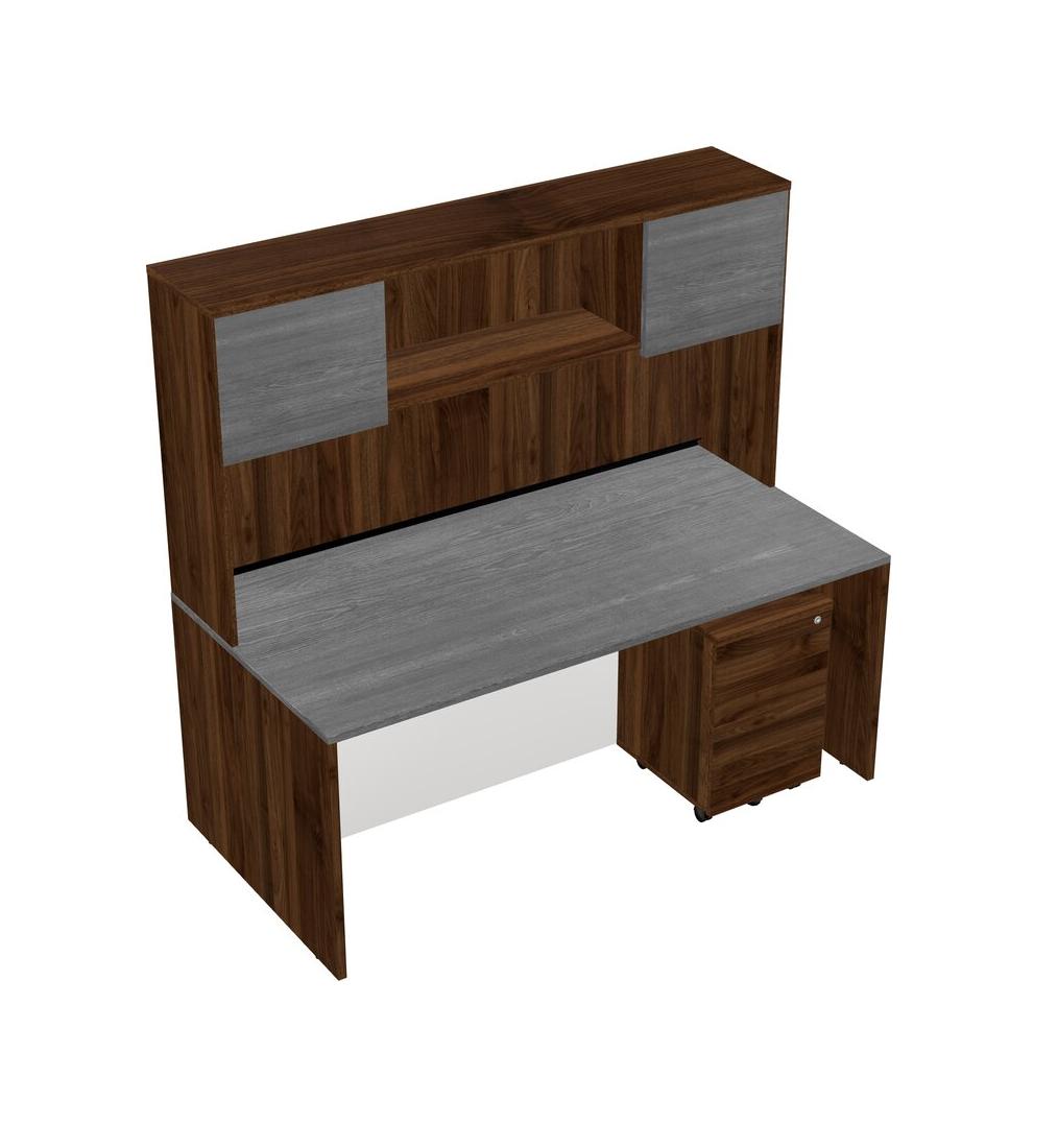 Grey Rectangular Office Desk Plus Columbia Walnut Wooden Mobile Drawers And Columbia Walnut Hutch