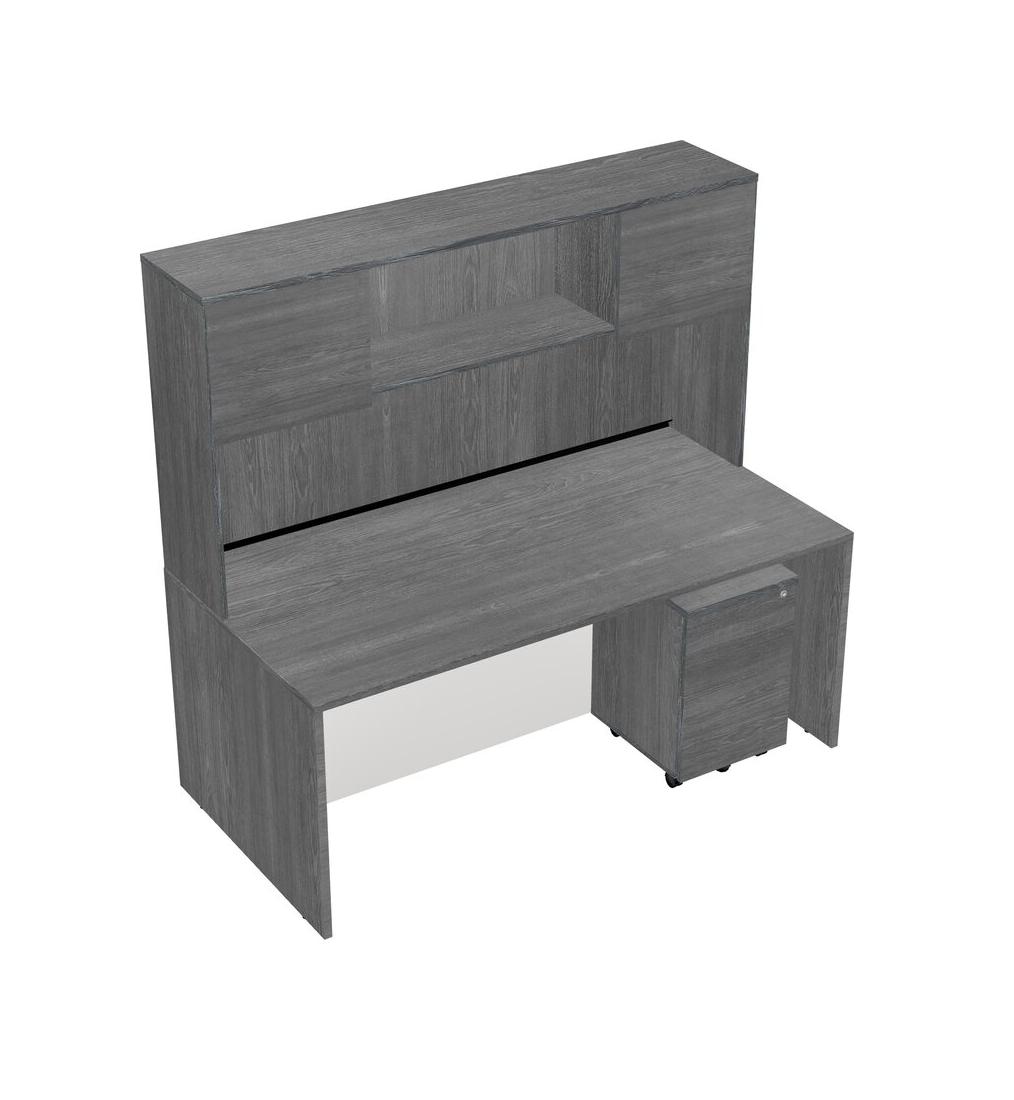 Grey Rectangular Office Desk Plus Grey Wooden Mobile Drawers And Grey Hutch